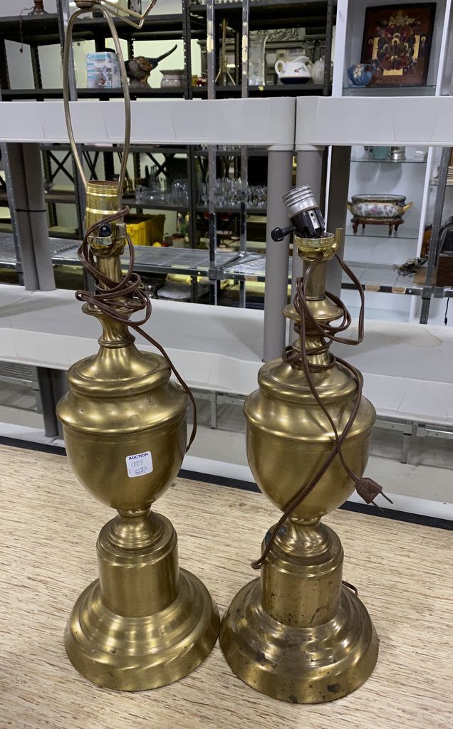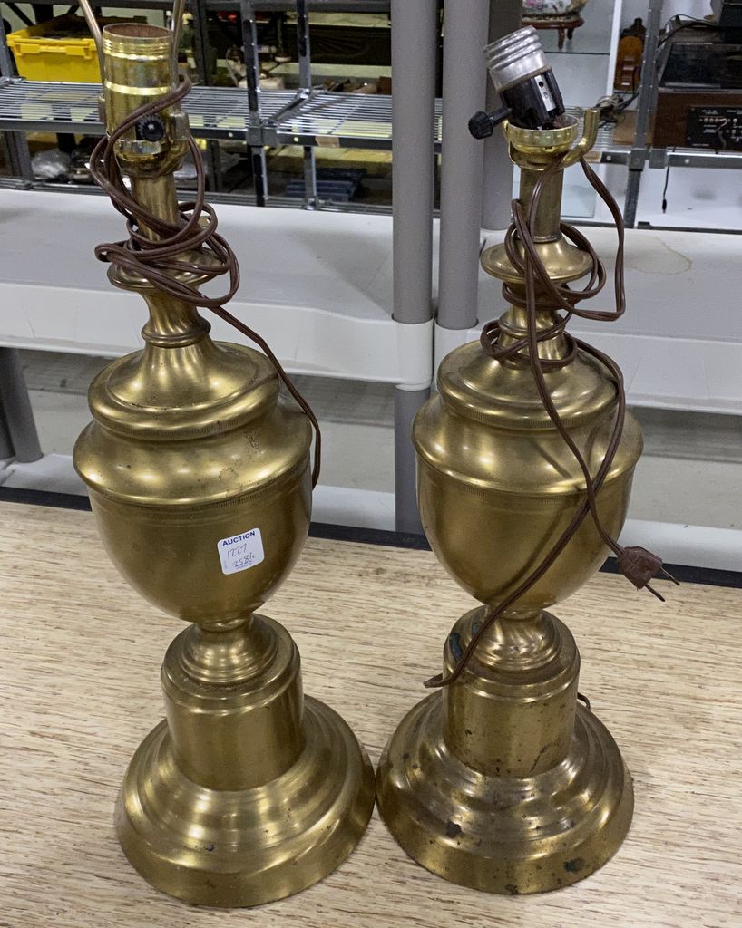 Pair of Mid Century Brass Urn Lamps, no shades, has wear and tarnish, 22"h. Pair of Mid Century Brass Urn Lamps, no shades, has wear and tarnish, 22"h.