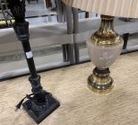 Three Decorative table lamps, brass lamp, metal black candle stick lamp, brass glass urn lamp, needs work, 30"h. Three Decorative table lamps, brass lamp, metal black candle stick lamp, brass glass urn lamp, needs work, 30"h.