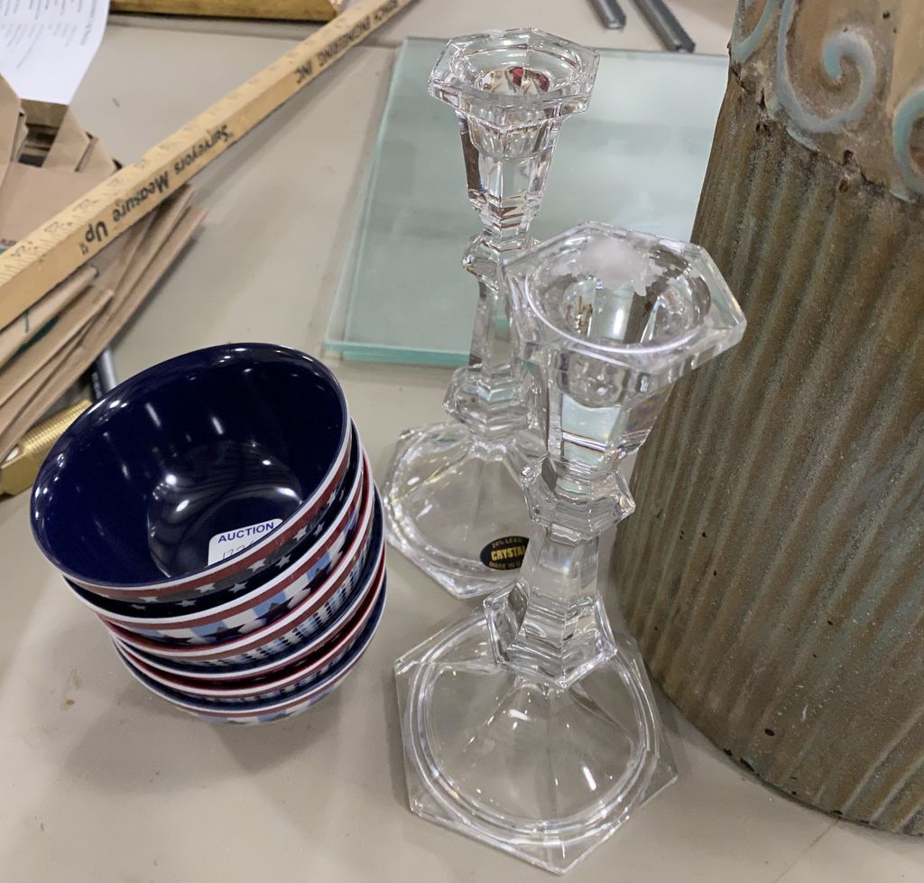 1236 Decorative Metal Canister, Pair of Crystal Candle Sticks, Plastic Bowls