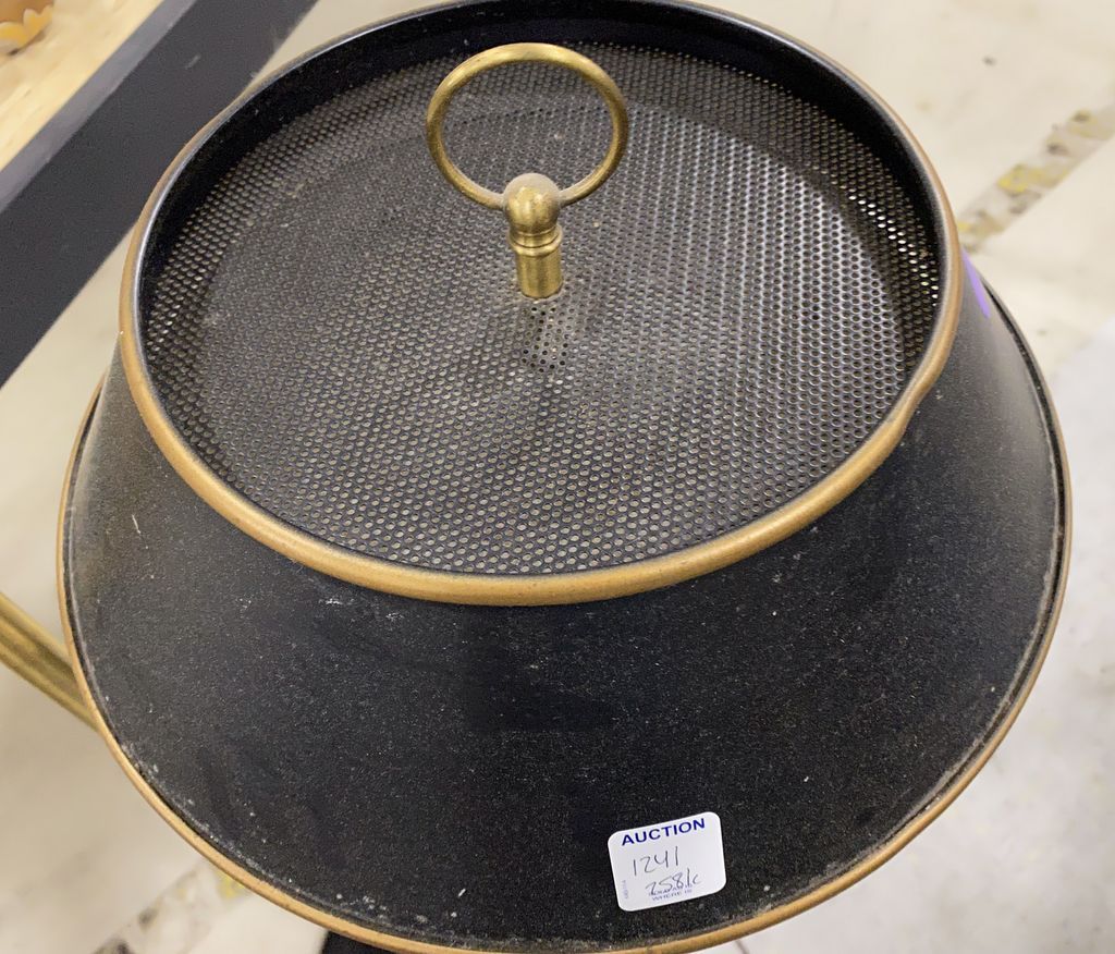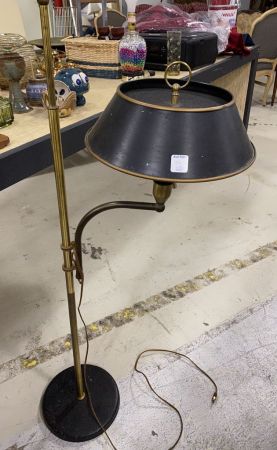 Tole Style Vintage Floor Lamp, brass with black shade, adjustable height, has age wear, 44"h. Tole Style Vintage Floor Lamp, brass with black shade, adjustable height, has age wear, 44"h.