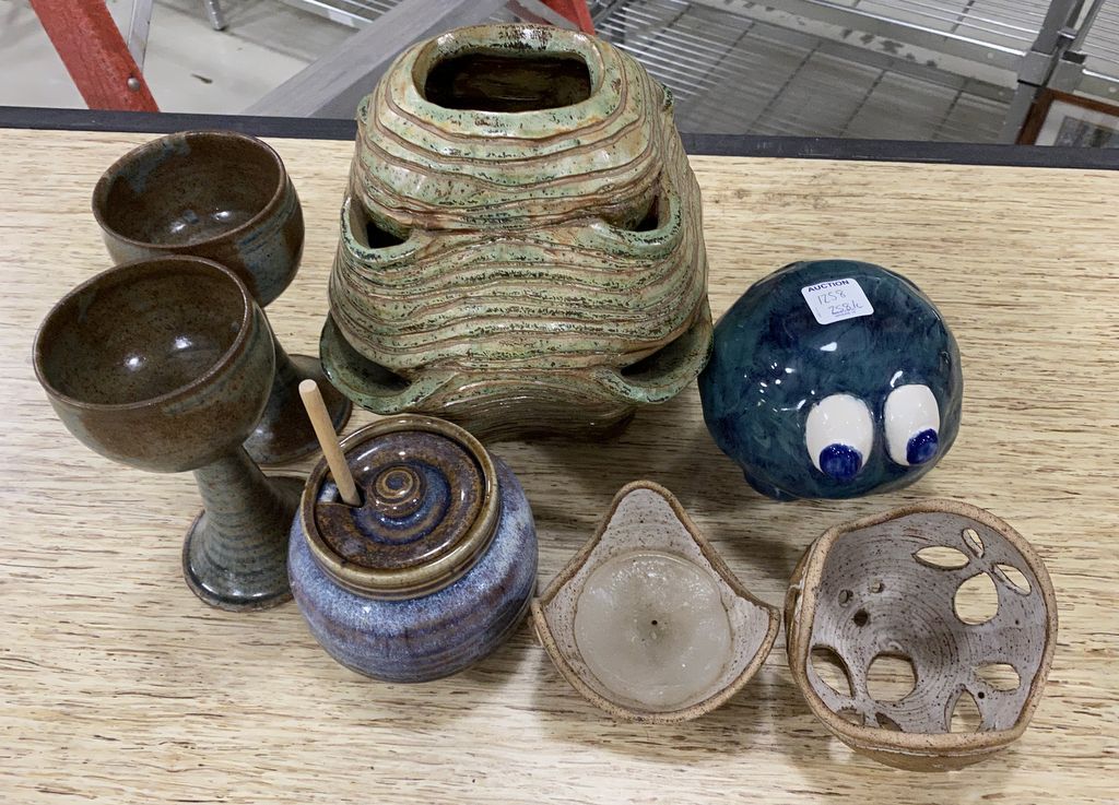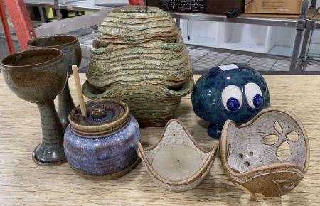 Collection of Hand Made Stoneware Pottery, tall goblets, sugar jar, candle holders, mushroom, unique large vase 8"h. Collection of Hand Made Stoneware Pottery, tall goblets, sugar jar, candle holders, mushroom, unique large vase 8"h.