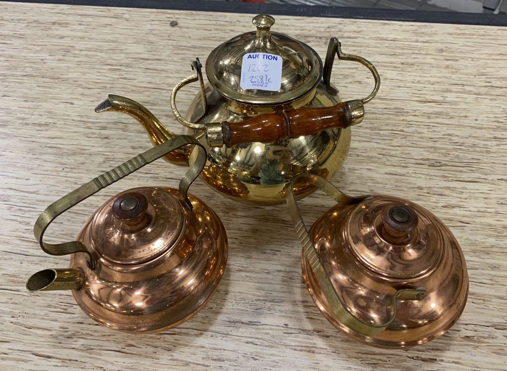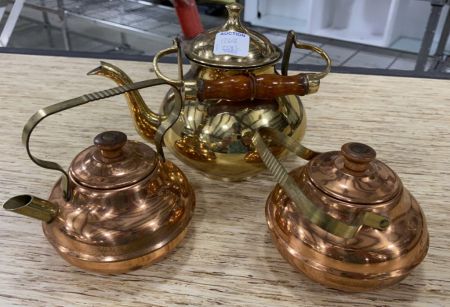Three Small Brass Pitchers, largest is 5"h. Three Small Brass Pitchers, largest is 5"h.