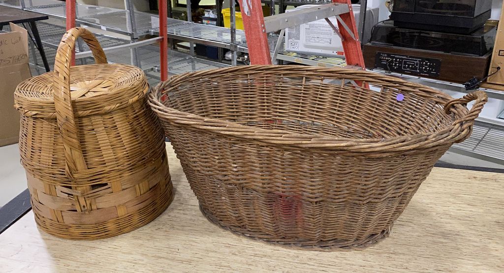 Large Woven Carrying Basket, missing a handle 29"w. and Handled Basket Hamper, has damage. Large Woven Carrying Basket, missing a handle 29"w. and Handled Basket Hamper, has damage.
