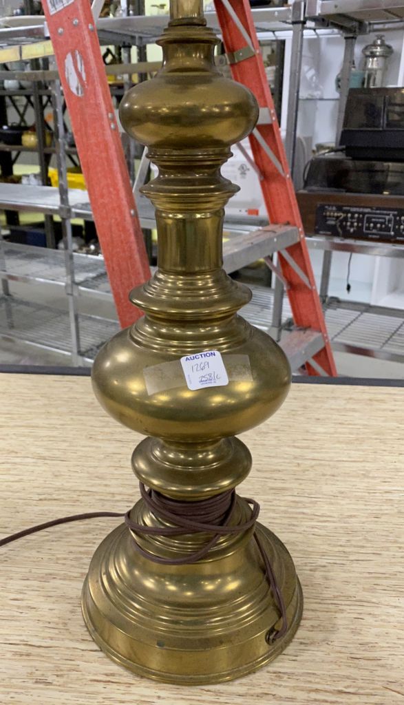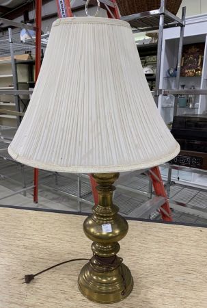 Vintage Brass Candle Stick Style Lamp, has age tarnish, with shade, 31"h. Vintage Brass Candle Stick Style Lamp, has age tarnish, with shade, 31"h.