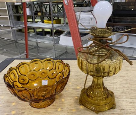 1279 Amber Pressed Glass Bowl and Amber Glass Oil Style Lamp
