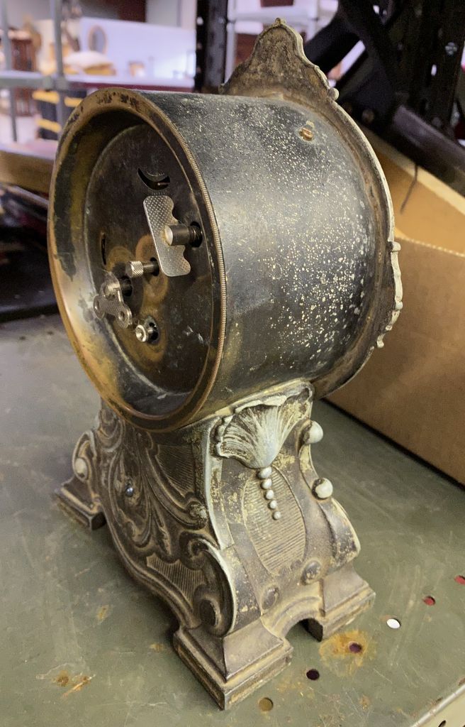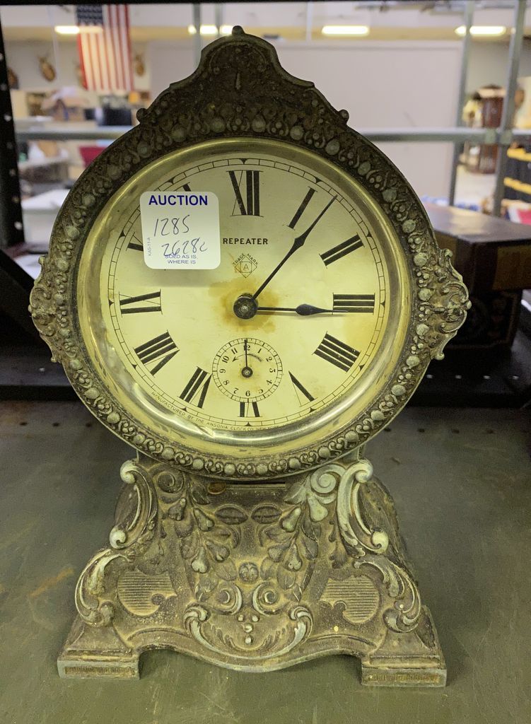 Vintage Repeater Mantle Clock, metal case, untested, has age wear, 9 1/2"h. Vintage Repeater Mantle Clock, metal case, untested, has age wear, 9 1/2"h.