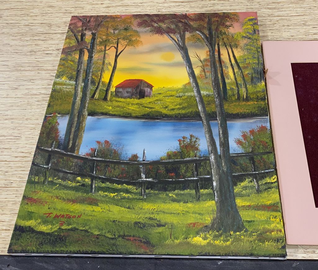 1288 T. Watson Landscape Painting and Needle Point Doves
