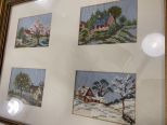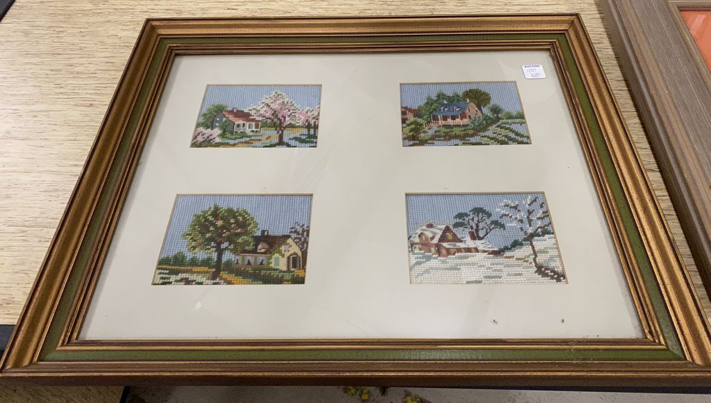 Four Home Place Needle Points Framed, matted, glass, framed, 19"h., 23"w. Four Home Place Needle Points Framed, matted, glass, framed, 19"h., 23"w.