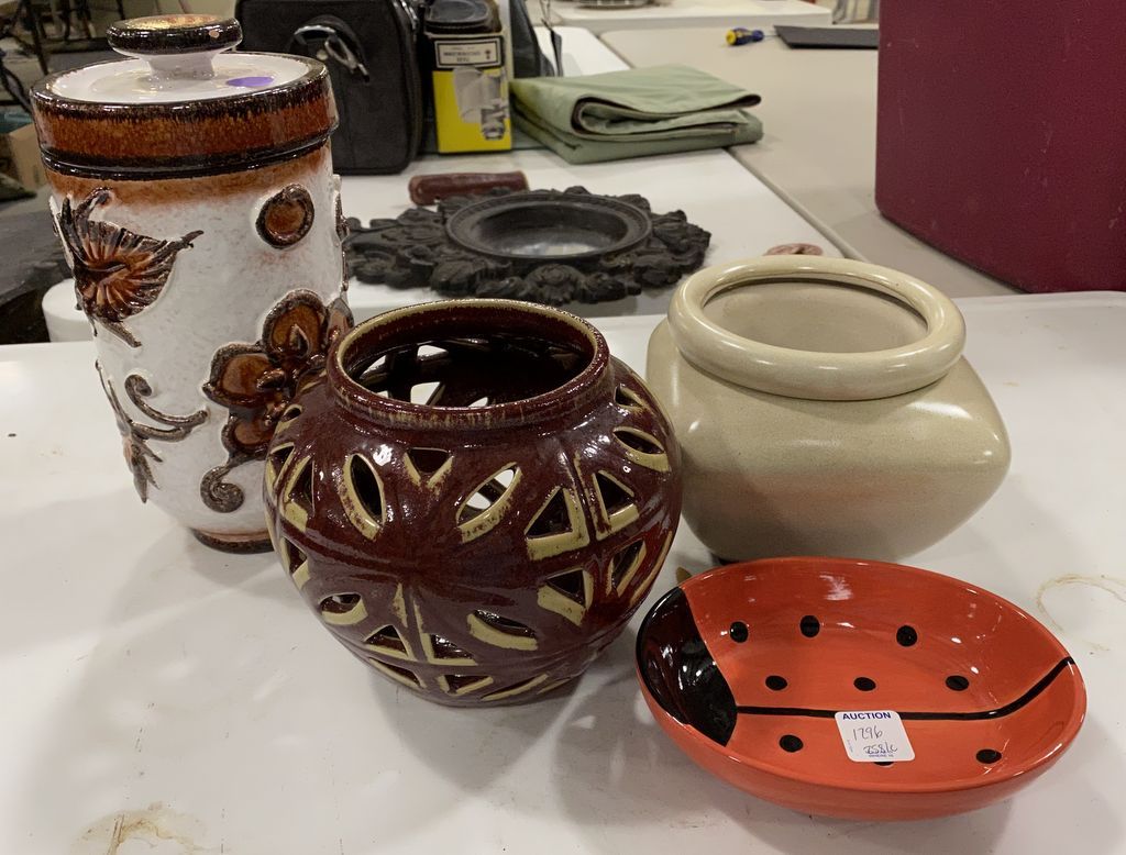 Pottery floral jar, pottery vase, stoneware vase, and lady bug dish. Pottery floral jar, pottery vase, stoneware vase, and lady bug dish.