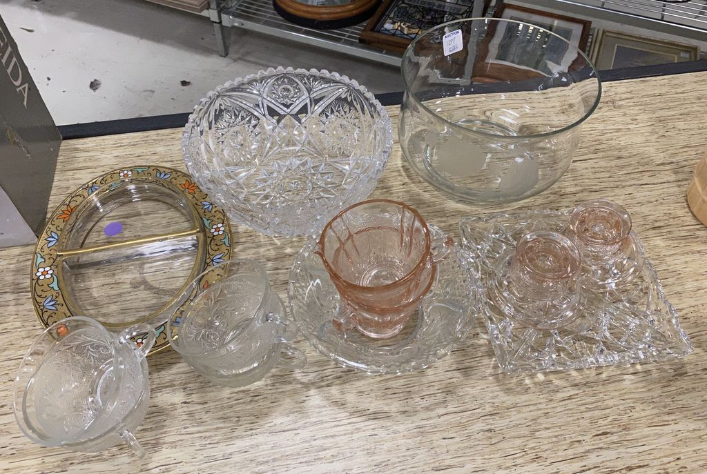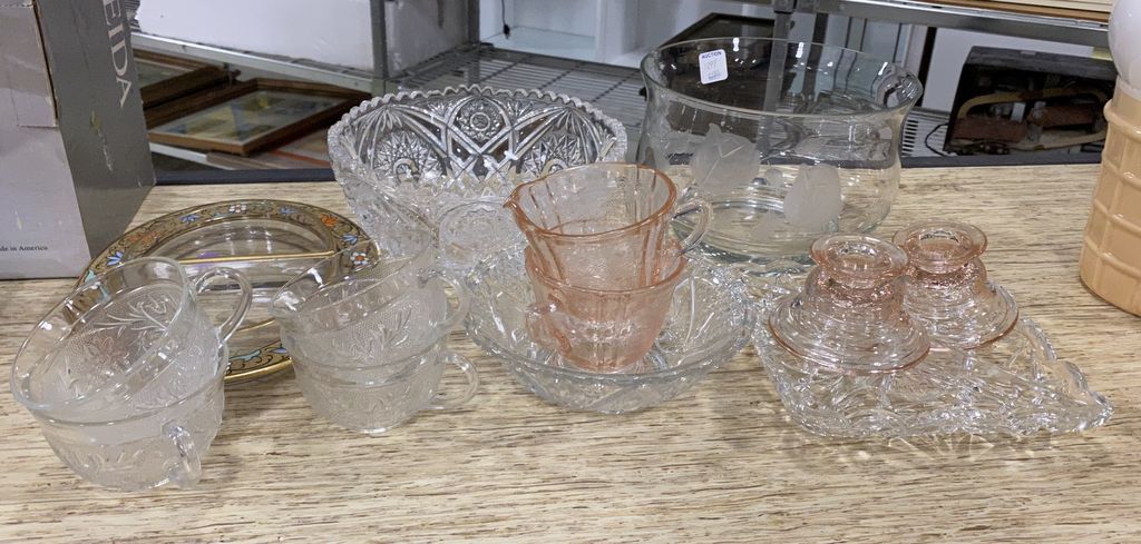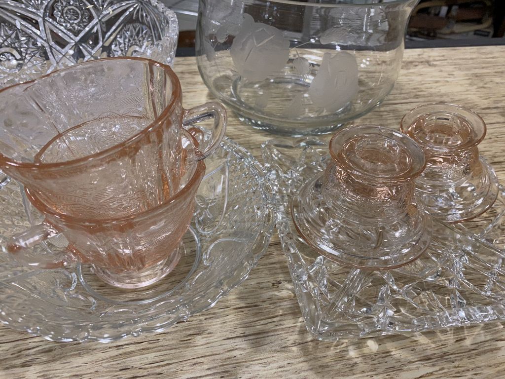 Collection of Glassware, pressed glass bowl, etched rose bowl, has rim chip, gold gilt dish, depression era punch cups, divided glass dish, candle sticks. Collection of Glassware, pressed glass bowl, etched rose bowl, has rim chip, gold gilt dish, depression era punch cups, divided glass dish, candle sticks.