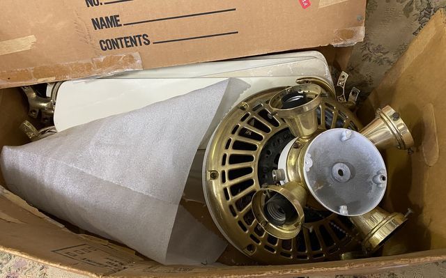 Used Brass Ceiling Fan, has blades, white and brass style. Used Brass Ceiling Fan, has blades, white and brass style.