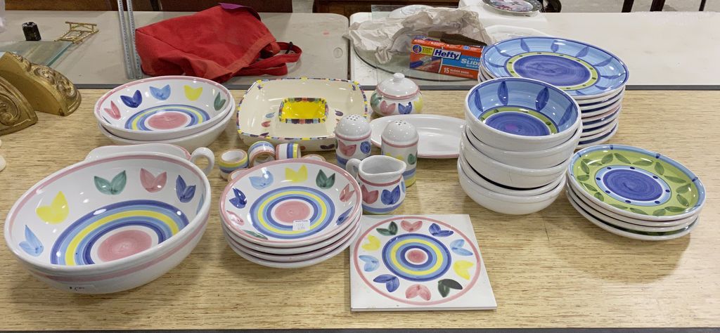 Italian "Claudio" Stoneware Pottery Set, chip & dip, serving bowls, napkins rings, salt & pepper, creamer, sugar, dinner plates, salad plates, bowls, hot plate. Italian "Claudio" Stoneware Pottery Set, chip & dip, serving bowls, napkins rings, salt & pepper, creamer, sugar, dinner plates, salad plates, bowls, hot plate.