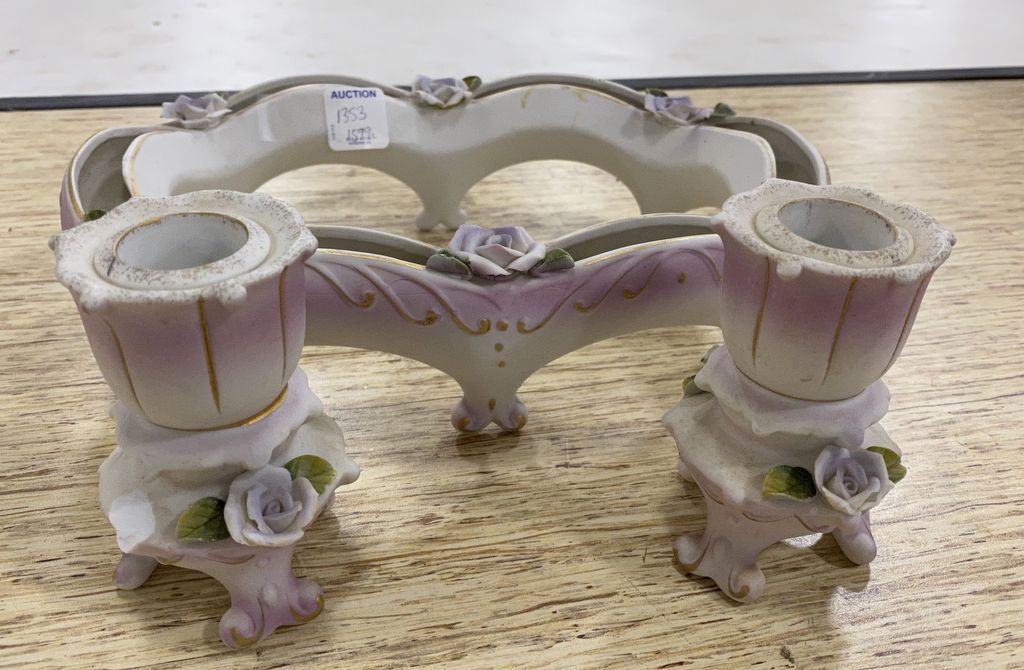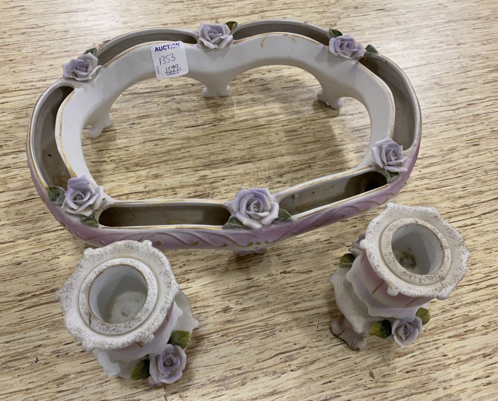 1353 Porcelain Footed Oval Vase and Pair of Candle Sticks