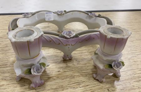 Porcelain Footed Oval Vase 11"w and Pair of Candle Sticks. Porcelain Footed Oval Vase 11"w and Pair of Candle Sticks.