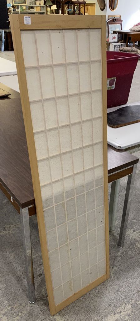 Wood Panel Screen, single panel, cloth paper cover, has holes, 59"h. 17"w. Wood Panel Screen, single panel, cloth paper cover, has holes, 59"h. 17"w.