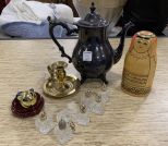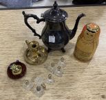1364 Silver Plate Pitcher, Russian Nesting Dolls, Brass Candle Holder, Glass Salt & Peppers