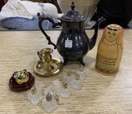 Silver Plate Pitcher, Russian Nesting Dolls, Brass Candle Holder, Glass Salt & Peppers. Silver Plate Pitcher, Russian Nesting Dolls, Brass Candle Holder, Glass Salt & Peppers.