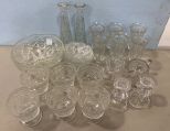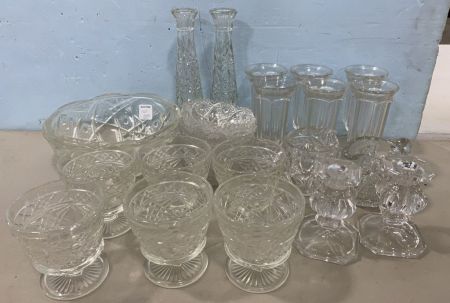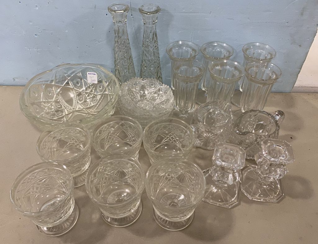 Group of vintage glassware, flower vases, pressed glass bowl, cups, creamers, candle holders. Group of vintage glassware, flower vases, pressed glass bowl, cups, creamers, candle holders.