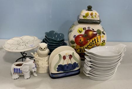 Group of pottery pieces, Biscotti jar, flower stand, Gail Pittman napkin holder, white dishes. Group of pottery pieces, Biscotti jar, flower stand, Gail Pittman napkin holder, white dishes.