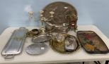 Large group of silver plate and brass, tree of life silver plate tray, serving tray, silver plate candle stick, brass round tray, butter dish, Mini Curio cabinet, hot plate, coasters. Large group of silver plate and brass, tree of life silver plate tray, serving tray, silver plate candle stick, brass round tray, butter dish, Mini Curio cabinet, hot plate, coasters.