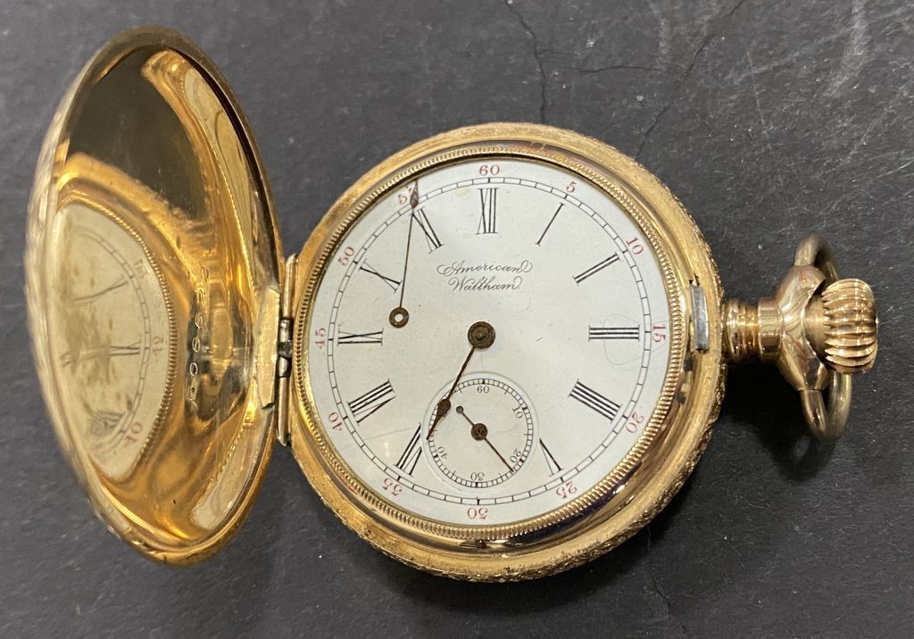American Waltham 14K Pocket Watch, marked crown 14K, runs, 6033593, engraved, minor wear. Estimated year 1890, size 6s. American Waltham 14K Pocket Watch, marked crown 14K, runs, 6033593, engraved, minor wear. Estimated year 1890, size 6s.