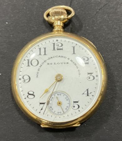 Mermod Jaccard & King Co. St. Louis Open Face, small, marked 14K Dueber, runs, 899877, monogramed on back. Mermod Jaccard & King Co. St. Louis Open Face, small, marked 14K Dueber, runs, 899877, monogramed on back.