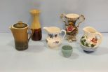 Lefton blue and white pottery pitcher, Gail Pittman pitcher, Calypso covered teapot, Capodimonte 9" vase & Armbee pottery wine jar Lefton blue and white pottery pitcher, Gail Pittman pitcher, Calypso covered teapot, Capodimonte 9" vase & Armbee pottery wine jar