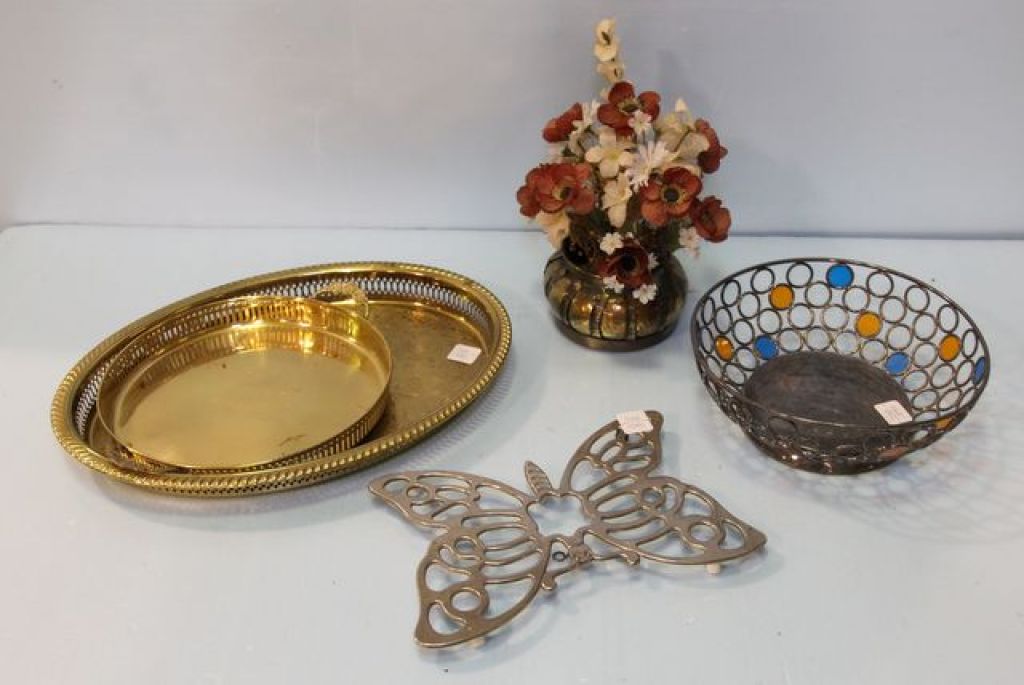 Two brass trays, pot, butterfly trivet & decorative bowl Two brass trays, pot, butterfly trivet & decorative bowl