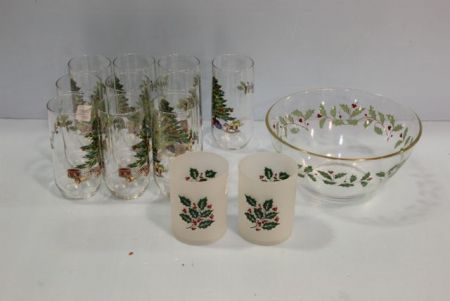 744 Ten Christmas Glasses, Bowl & Two Frosted Juice Glasses