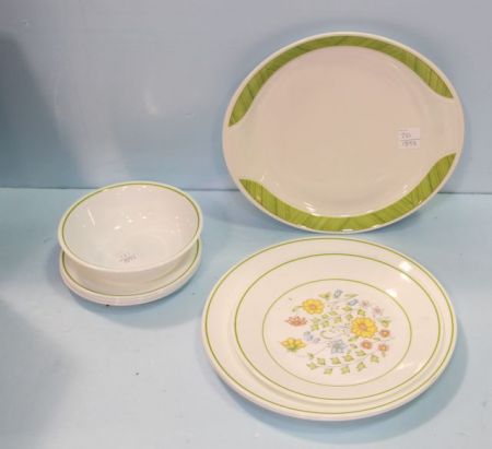 Four Corelle plates, four saucers, bowl & Syracuse china plate Four Corelle plates, four saucers, bowl & Syracuse china plate