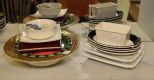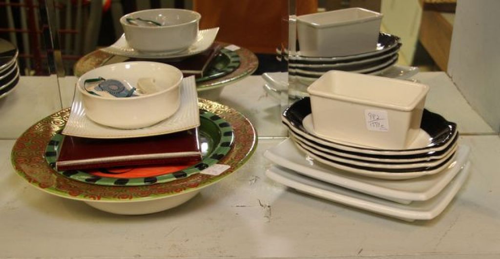 Two Pier 1 trays, four Homer Laughlin trays, bowls, plate & trivet Two Pier 1 trays, four Homer Laughlin trays, bowls, plate & trivet