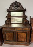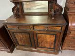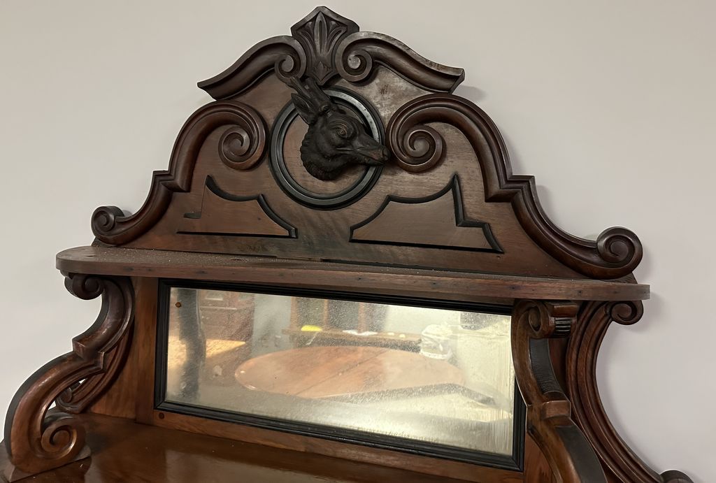 Antique George III Style Hutch/Server, walnut, two piece, Carved Stag crest, age wear, 76"h., 50"w. 19"d. Location Storage Office Antique George III Style Hutch/Server, walnut, two piece, Carved Stag crest, age wear, 76"h., 50"w. 19"d. Location Storage Office