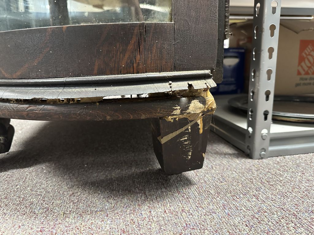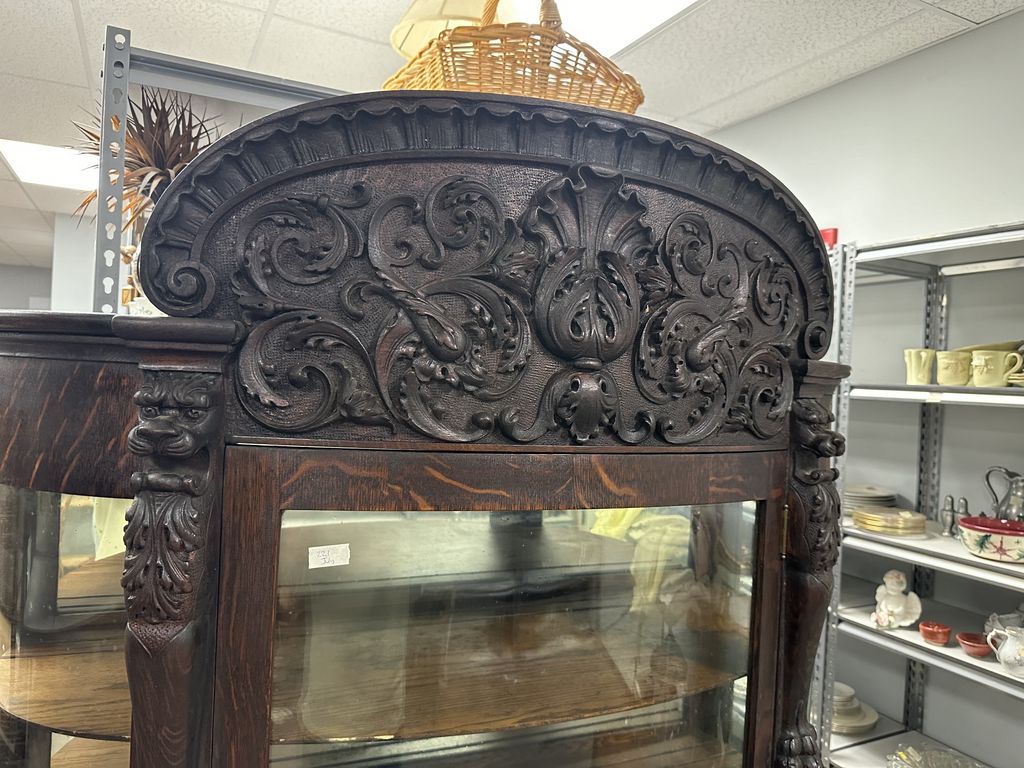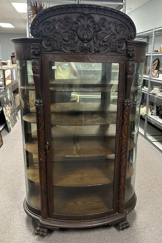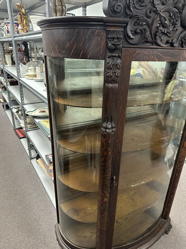 Late 1800's Ornate Carved Victorian Curved Glass China Cabinet, wood shelves, back leg needs repair, has key, 75"h., 46"w, 20"d. Location Right Metal Shelves Late 1800's Ornate Carved Victorian Curved Glass China Cabinet, wood shelves, back leg needs repair, has key, 75"h., 46"w, 20"d. Location Right Metal Shelves