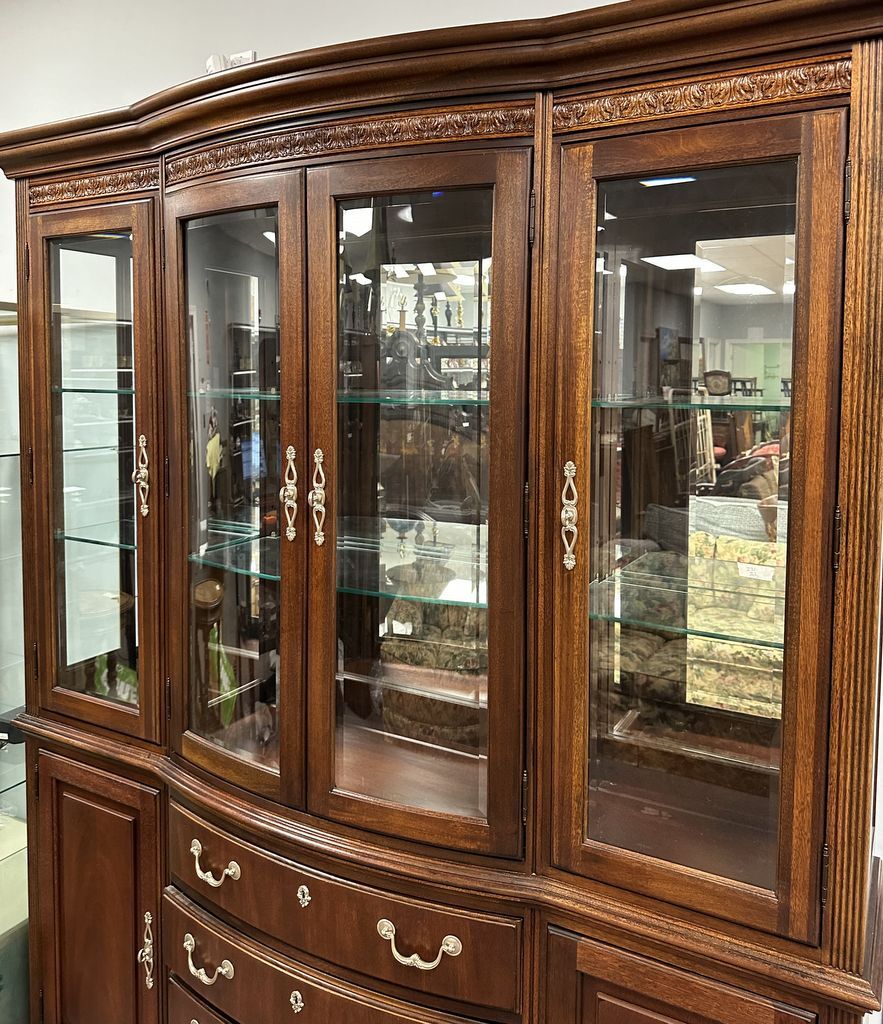 Impression by Thomasville China Cabinet, traditional style, mirrored back, two piece, good condition, 85"h., 70"w. Location Front Left Wall Impression by Thomasville China Cabinet, traditional style, mirrored back, two piece, good condition, 85"h., 70"w. Location Front Left Wall