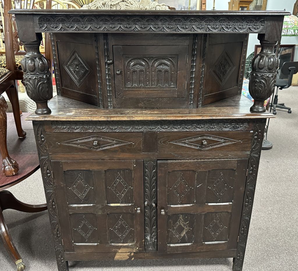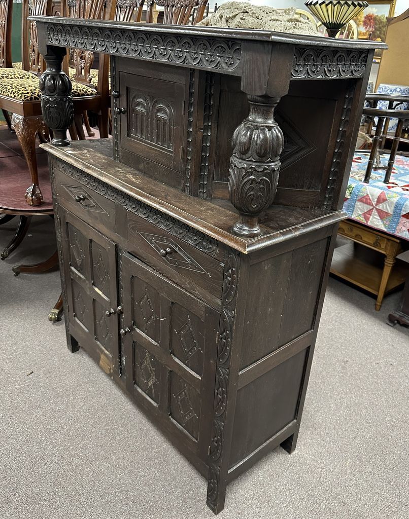 Antique Jacobean Style Court Cupboard, has finish wear and age wear, 60"h., 48"w., 18"d. Location Row 4 Antique Jacobean Style Court Cupboard, has finish wear and age wear, 60"h., 48"w., 18"d. Location Row 4