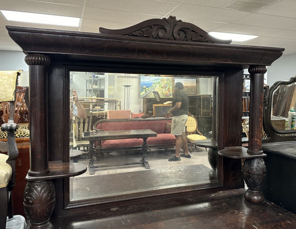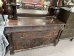 Late 1800s Victorian Oak Sideboard, two piece back mirror, needs work and finish work on veneer. Location Row 3 Late 1800s Victorian Oak Sideboard, two piece back mirror, needs work and finish work on veneer. Location Row 3