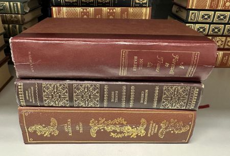Three Gold Leather Bound Books, Farewell to France, Robinson Crusoe, Anna Karenina, Location Back Metal Shelves 20 Three Gold Leather Bound Books, Farewell to France, Robinson Crusoe, Anna Karenina, Location Back Metal Shelves 20