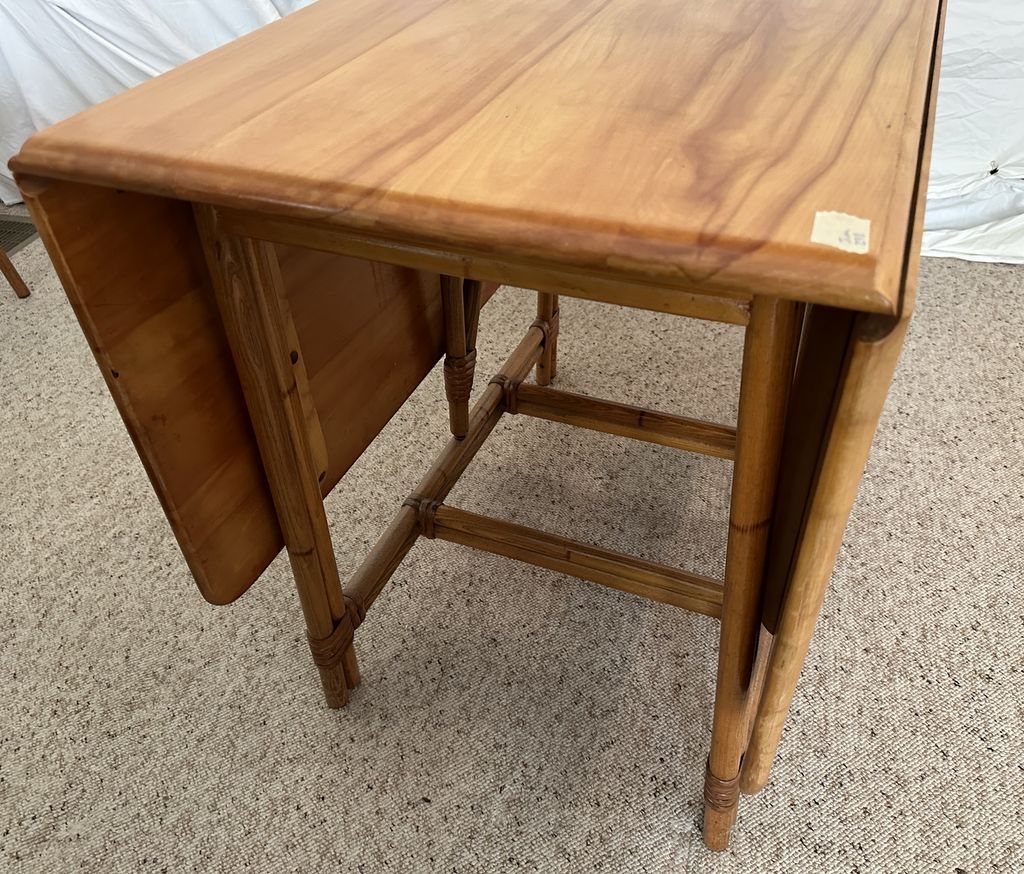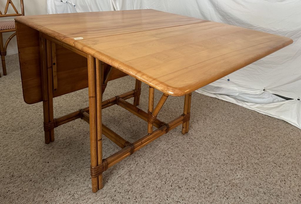 Ca. 1950s Heywood Wakefield Drop Leaf Dining Table, rattan bamboo, good condition, circular stamp, 29"h., 36"w., 55"long. Location Row 3 Ca. 1950s Heywood Wakefield Drop Leaf Dining Table, rattan bamboo, good condition, circular stamp, 29"h., 36"w., 55"long. Location Row 3