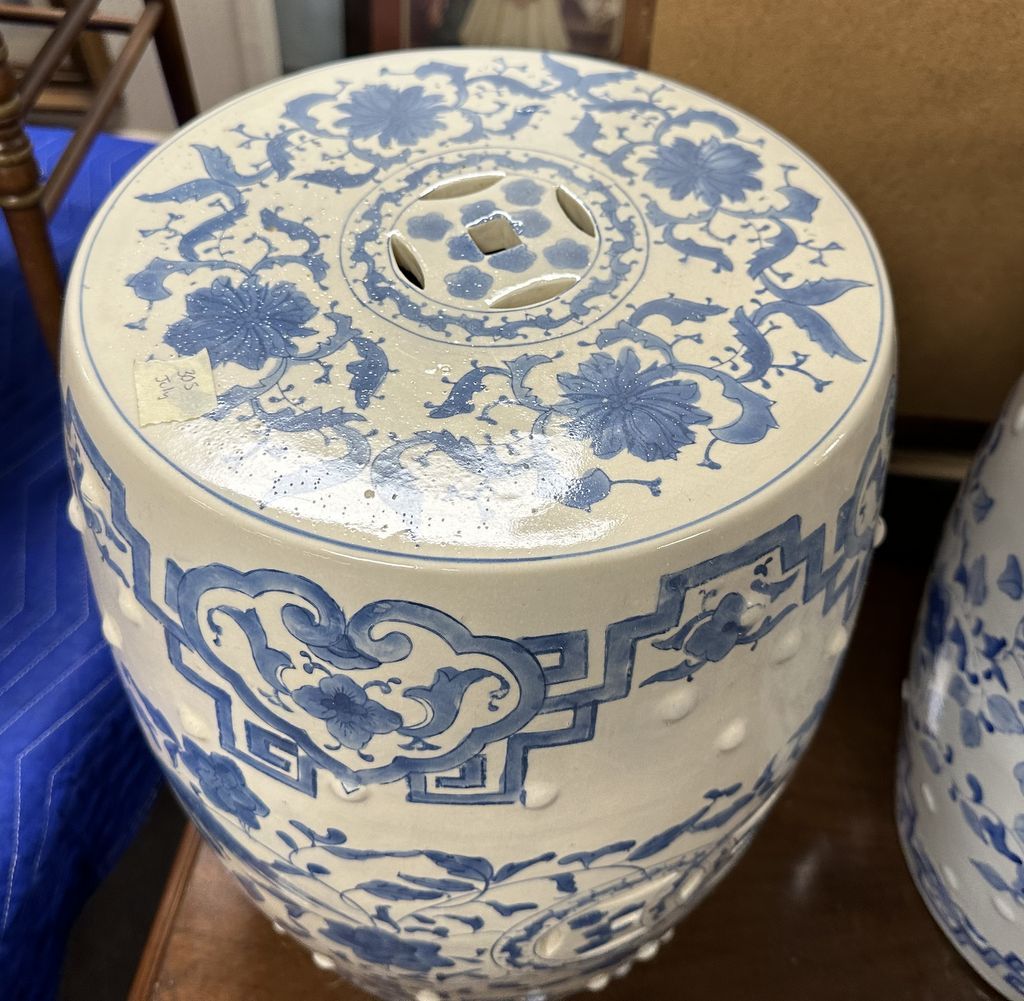 Chinese Blue and White Porcelain Garden Seat, 18"h., 12"dia Location Row 6 Chinese Blue and White Porcelain Garden Seat, 18"h., 12"dia Location Row 6