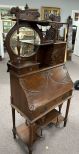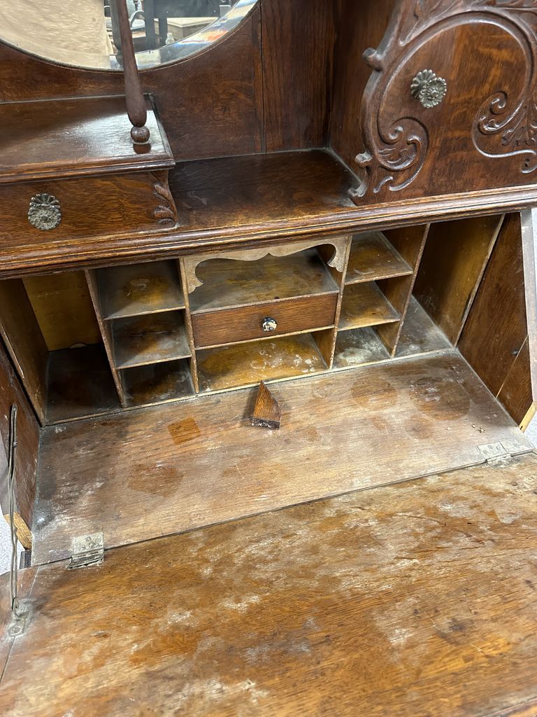 Antique Edwardian Oak Secretary, drop front desk, oval mirror, needs working and tightening, 67"h., 32"w. Location Row 3 Antique Edwardian Oak Secretary, drop front desk, oval mirror, needs working and tightening, 67"h., 32"w. Location Row 3