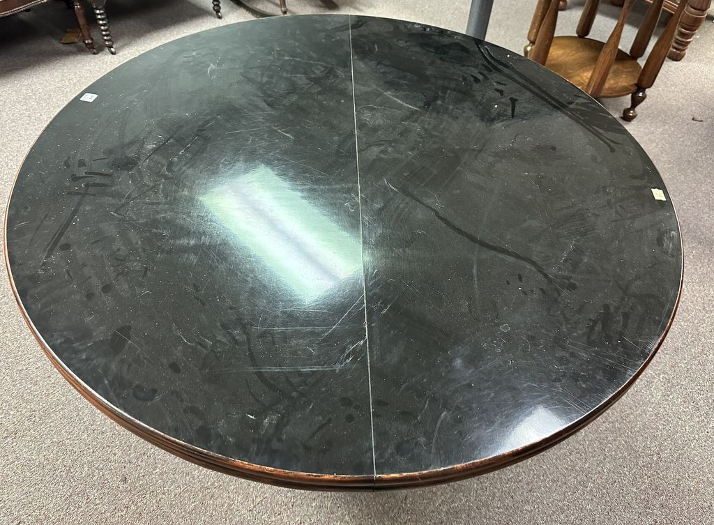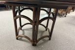 20th Century Bamboo Style Dining Table, black finish top, has scuffs and light scratches, four leaves, without leaves in round 28"h., 48"w. Location Storage Office 20th Century Bamboo Style Dining Table, black finish top, has scuffs and light scratches, four leaves, without leaves in round 28"h., 48"w. Location Storage Office