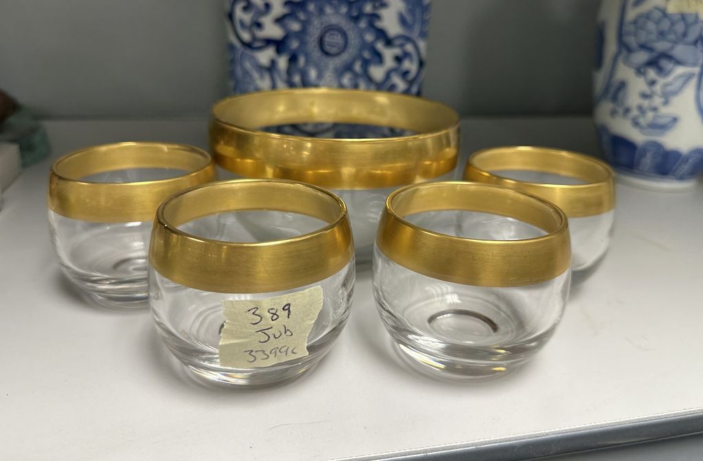 Dorothy Thorpe Style Gold Rim Roly Poly Glasses and Bowl, Location Back Metal Shelves 19 Dorothy Thorpe Style Gold Rim Roly Poly Glasses and Bowl, Location Back Metal Shelves 19