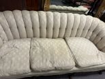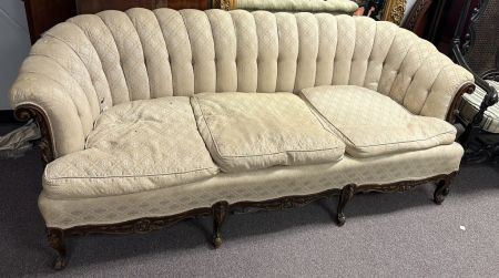 Vintage French Upholstered Three Cushion Sofa, button tufted, 81"long. Location storage Office Vintage French Upholstered Three Cushion Sofa, button tufted, 81"long. Location storage Office