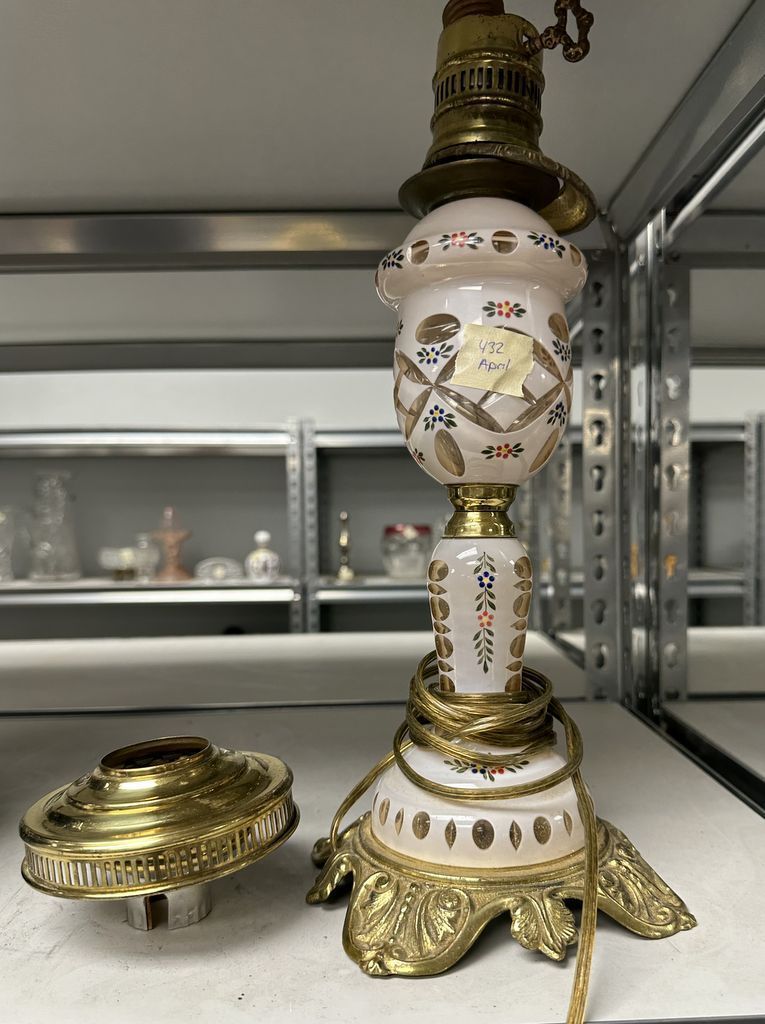 Bohemian Cut to Clear White Glass Lamp, needs some work, good condition, 15", Location Right Metal Shelves Bohemian Cut to Clear White Glass Lamp, needs some work, good condition, 15", Location Right Metal Shelves