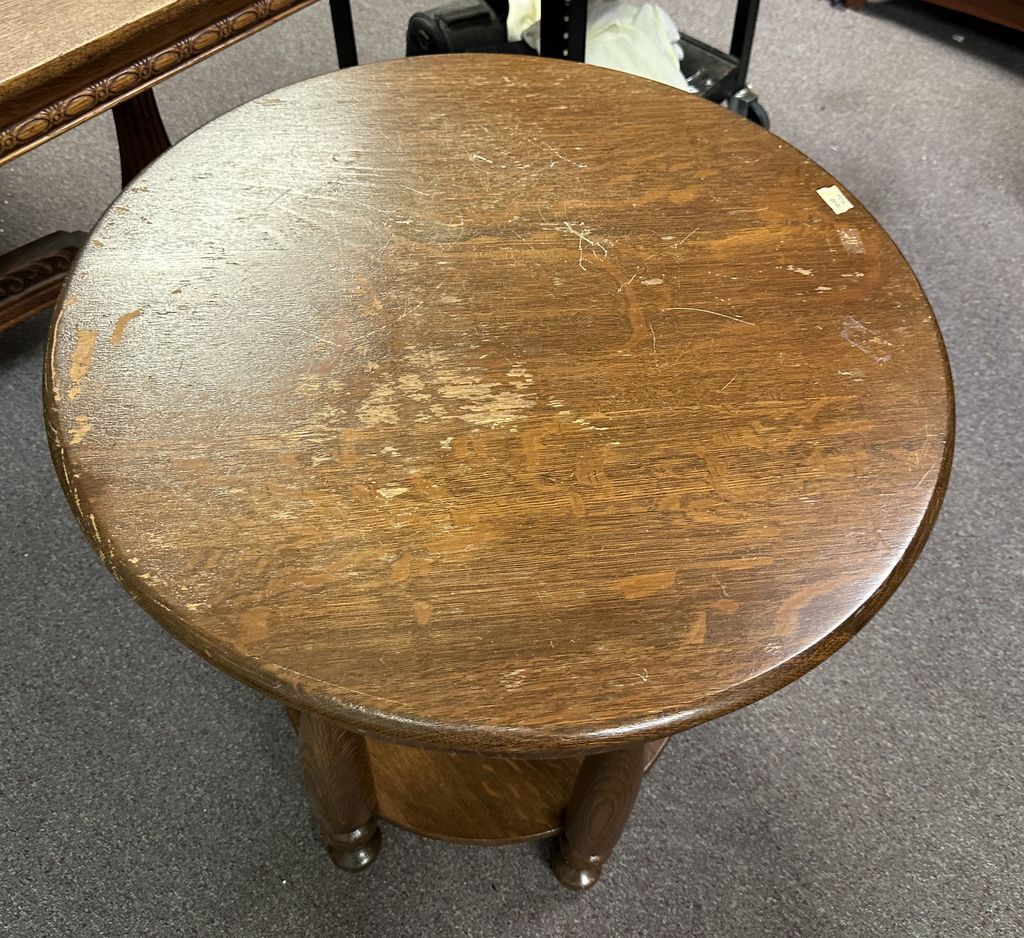 Early 1900s Victorian Oak Round Lamp Table, worn spots on top, needs tightening, 28"h., 27"dia. Location Storage Office Early 1900s Victorian Oak Round Lamp Table, worn spots on top, needs tightening, 28"h., 27"dia. Location Storage Office