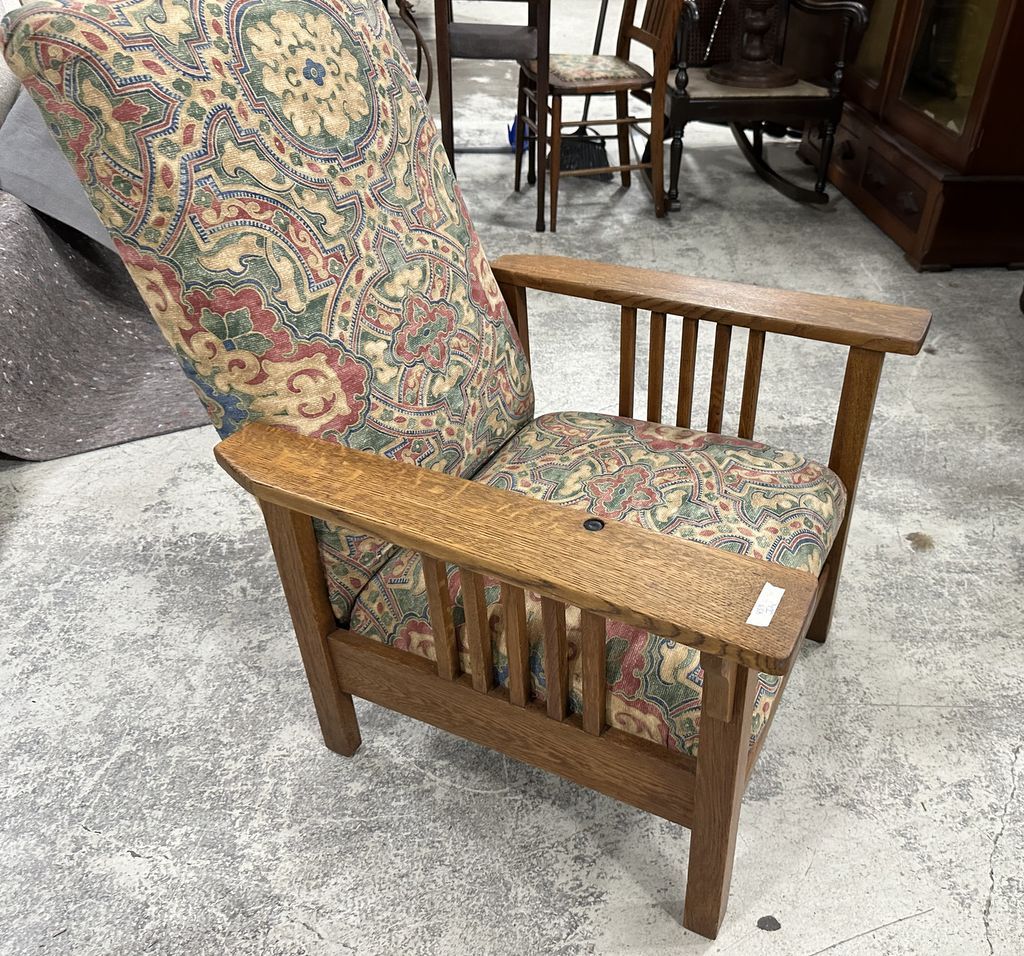 Mission Style Oak Recliner Chair, upholstered, good condition. Location Row 2 Mission Style Oak Recliner Chair, upholstered, good condition. Location Row 2