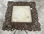 Victorian Style Ornate Metal Pedestal Stand, marble inset, 29"h., 13"dia Location Row 5 Victorian Style Ornate Metal Pedestal Stand, marble inset, 29"h., 13"dia Location Row 5