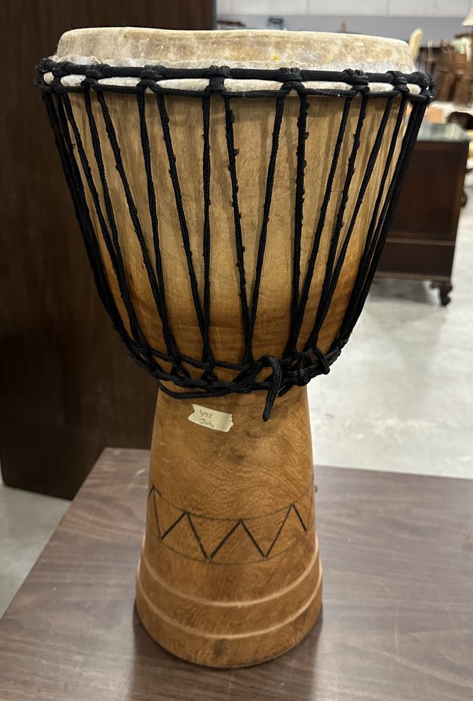 African Bongo Hand Crafted Drum, animal hide top, hand carved, 24"h., 13"dia, Location Left Front Office African Bongo Hand Crafted Drum, animal hide top, hand carved, 24"h., 13"dia, Location Left Front Office