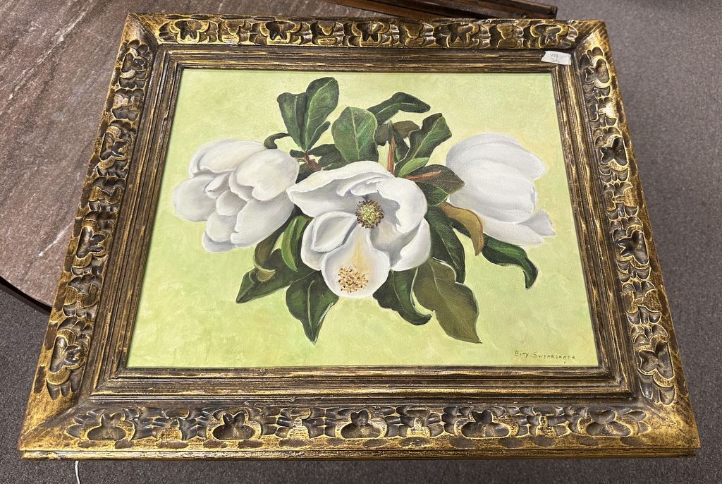 Signed Betty Hamilton Magnolia Still Life Painting, on canvas, framed, 22"h., 26"w Mississippi Location Right Wood Cart Signed Betty Hamilton Magnolia Still Life Painting, on canvas, framed, 22"h., 26"w Mississippi Location Right Wood Cart