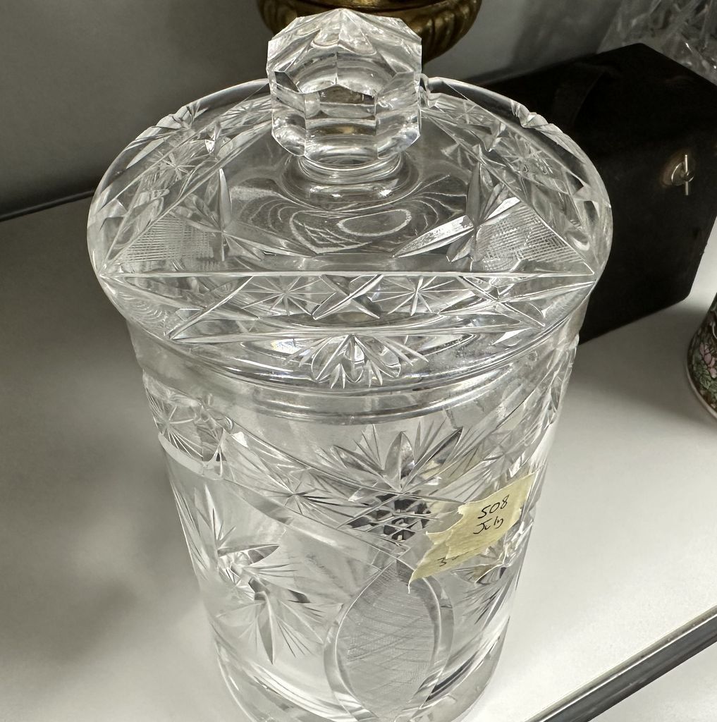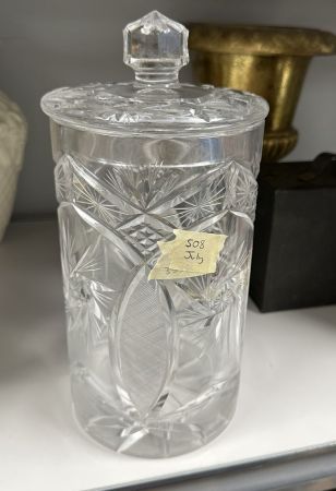 Modern Cut Glass Biscuit Jar, lidded, 11"h, Location Back Metal Shelves 18 Modern Cut Glass Biscuit Jar, lidded, 11"h, Location Back Metal Shelves 18